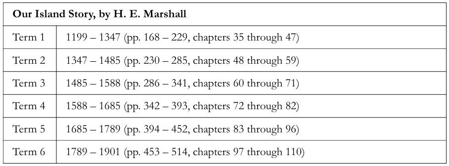 They would read an average of fifty-seven pages a term and the P.U.S. suggested rotation for these books is listed below (please note that later editions of Our Island Story included about 38 extra pages, very briefly describing the death of Queen Victoria, reign of Edward VII, and the Great War of 1914):