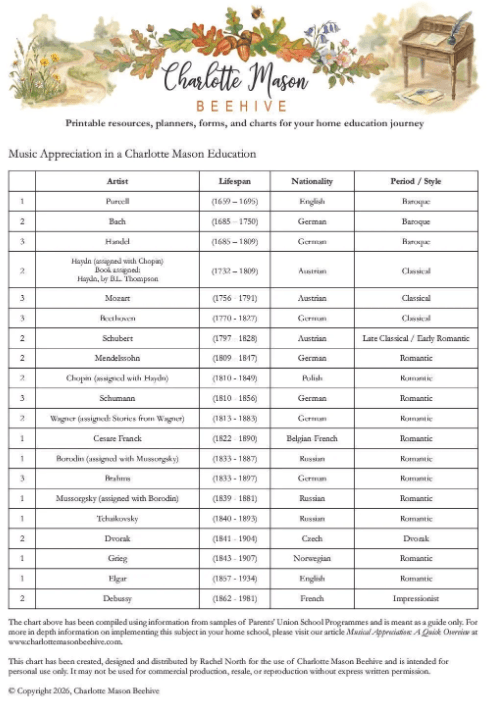 A chart detailing all the composers used in Charlotte Mason's programmes (that we have available) and where they fit into your history studies.