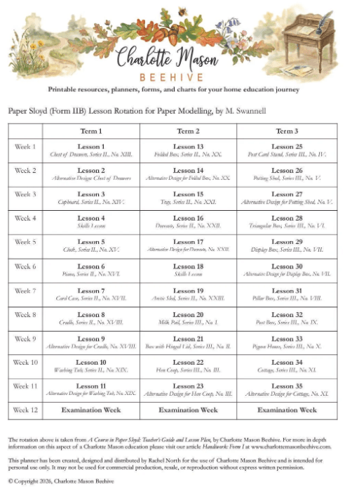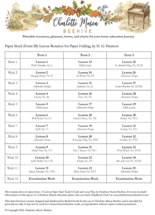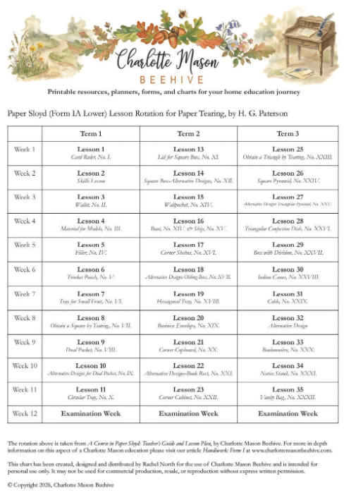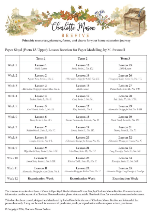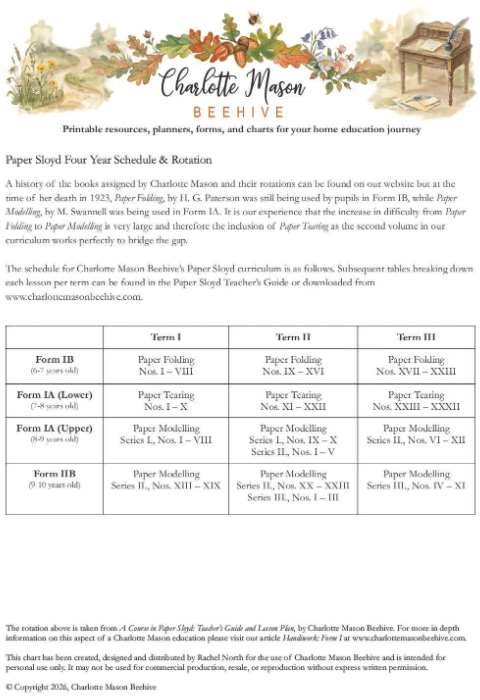 The complete four-year rotation for A Course in Paper Sloyd, by Charlotte Mason Beehive.