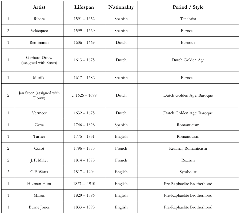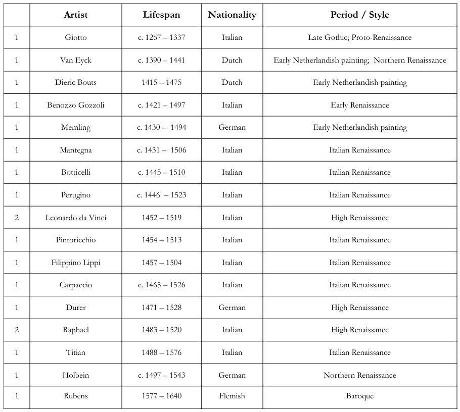 There are literally hundreds and hundreds of wonderful artists to choose from each term; however for interest sake, the following thirty-two artists were included on the programmes between 1921 and 1933. The table shows how many times the artist was used in this time, the artists’ lifespan, nationality, and the period/style of his work. There are a couple of instances where two artists were assigned to be studied side-by-side together during a term. This is indicated on the table.