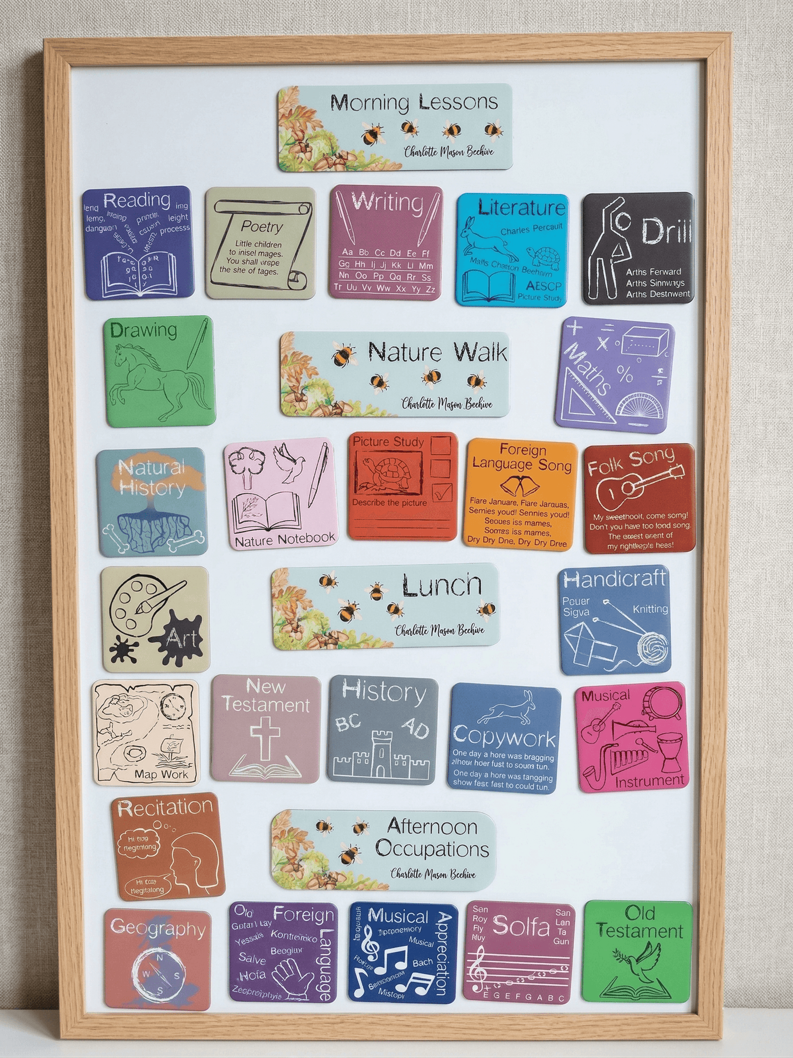 The subjects included are as follows: Drawing, Foreign Language, Geography, Musical Appreciation, Maths, Literature, Natural History, Art, Old Testament, New Testament, Recitation, Picture Study, Writing, Handicraft, Poetry, History, Copywork, Reading, Folk Song, Drill, Nature Notebook, Solfa, Musical Instrument, and Foreign Language Song.