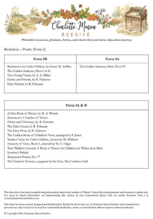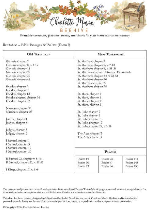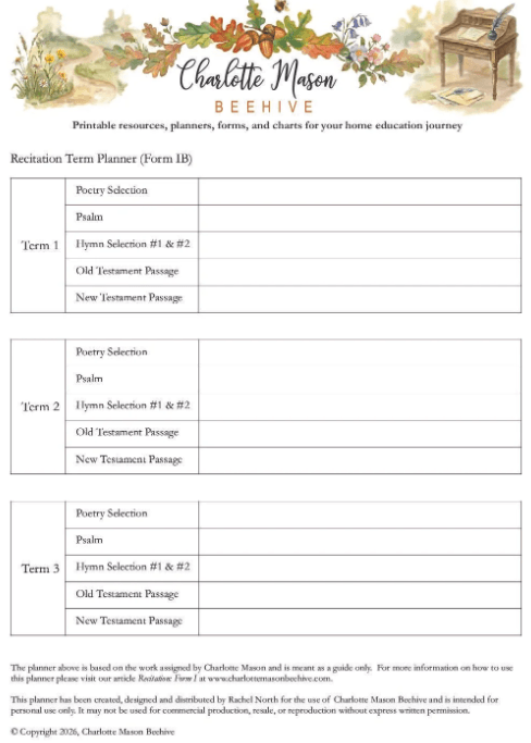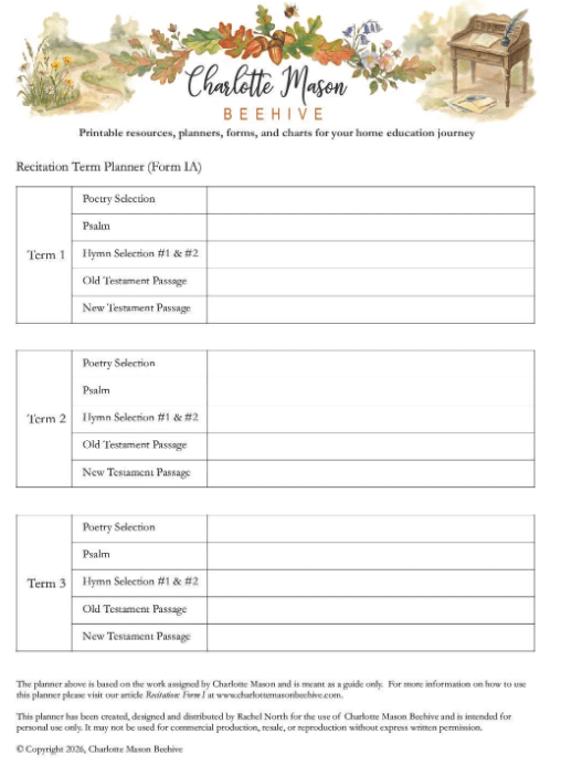 Plan your term's Recitation passages with our Term Planner. Based off work assigned by Charlotte Mason in her programmes.