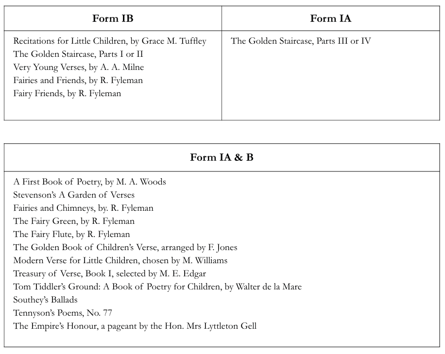 The poetry books assigned in the P.N.E.U are listed below; they are organised according to whether they were used in just Form IB, or IA, or across both form levels.