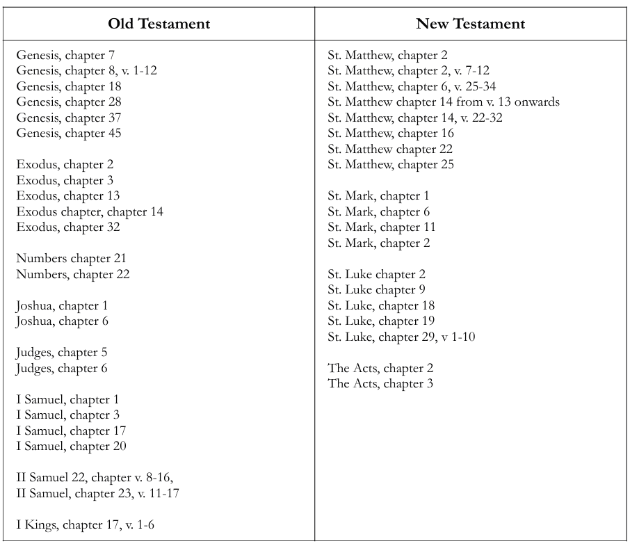 The programmes, although not usually specifying the exact verses to be learnt, nearly always gave a chapter from the Bible by which the passages would be chosen. Below is a list of the books from the Bible and the chapters that were specified in the programmes for the recitation selections to be taken from. These passages were usually taken in line with the text covered during Bible lessons. (Very occasionally an exact passage was indicated).
