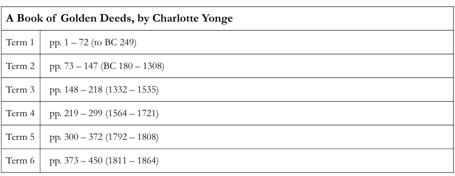 The students in Form IA were assigned two particular books to be read per term; however on occasion they were given suggestions of three or four books. One book nearly always on the programmes was A Book of Golden Deeds, by Charlotte Yonge. This book was read over the course of the entire two year period of IA and was broken up into shorter readings each term as follows.