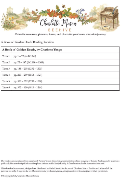 The complete reading rotation chart for A Book of Golden Deeds as assigned by Charlotte Mason for Sunday Reading.